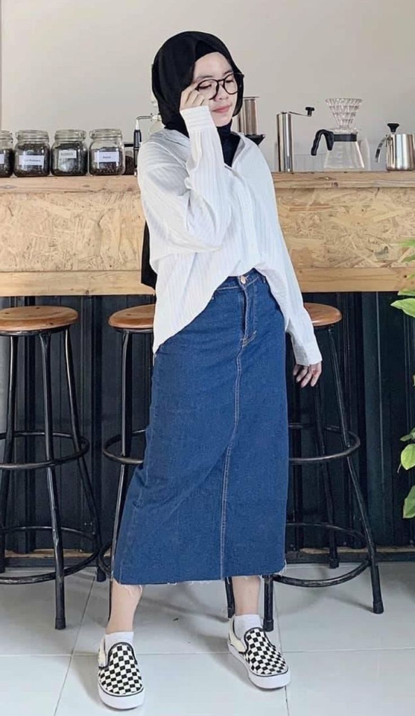 Untuk look sehari-hari, padukan rok jeans Anda dengan kaus longgar (oversized t-shirt) atau sweatshirt yang santai. Pilih hijab berbahan voal atau katun yang ringan. Maka dari itu, tambahkan sneakers putih dan tas selempang kecil untuk tampilan yang effortlessly chic saat berjalan-jalan di mall atau ke kampus.